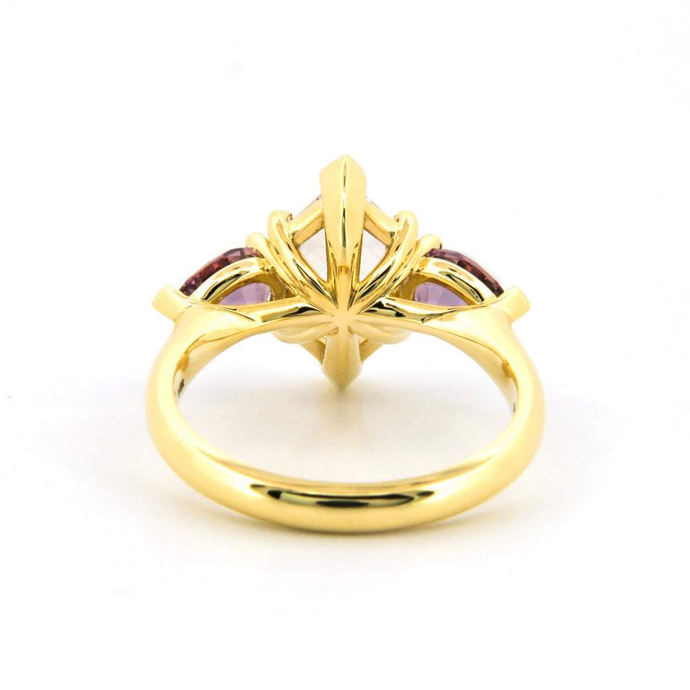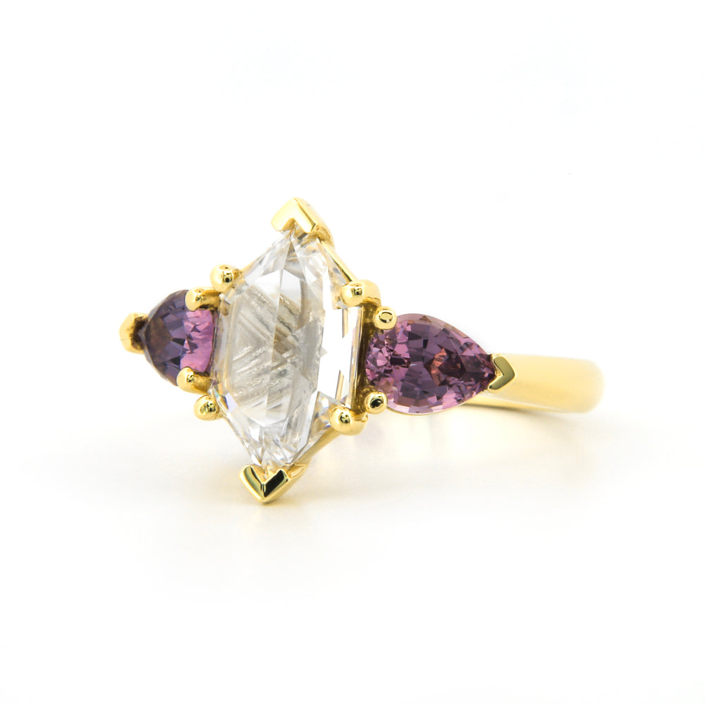 Custom 3 Stone Ring Featuring A Custom Cut Hexagonal Rose Cut Diamond And 2 Pear Shaped Violet Spinels
