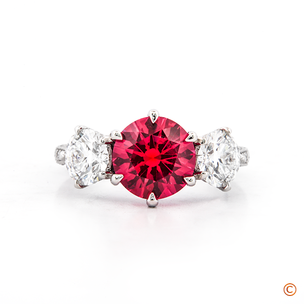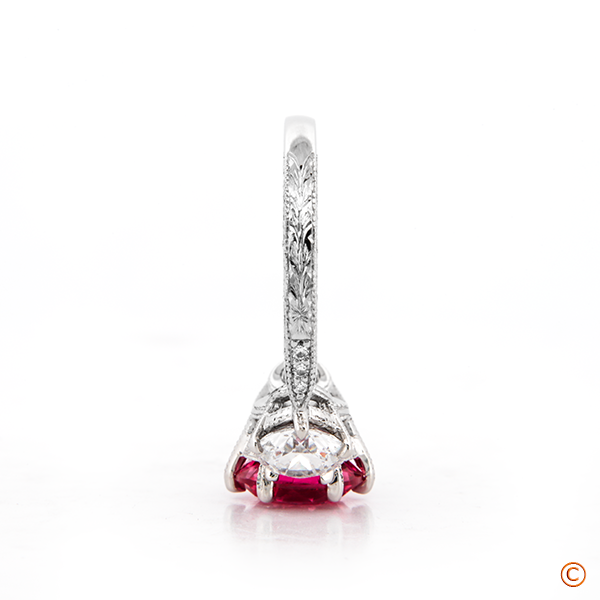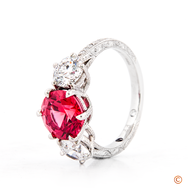Custom 3Stone Ring Featuring A 3.5Ct Pink Sapphire And Hand Engraving