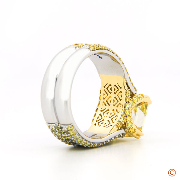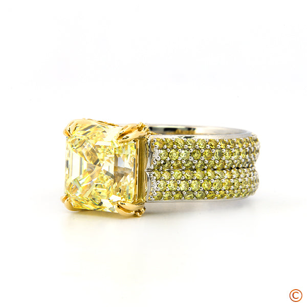 Custom Hand Assembled Cathedral Setting Featuring A 3.5Ct Fancy Yellow Square Emerald Center And Fancy Vivid Yellow Diamond Melee