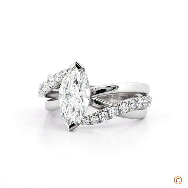 Custom Wide Three Band Style Engagement Ring with Pave Set Diamonds