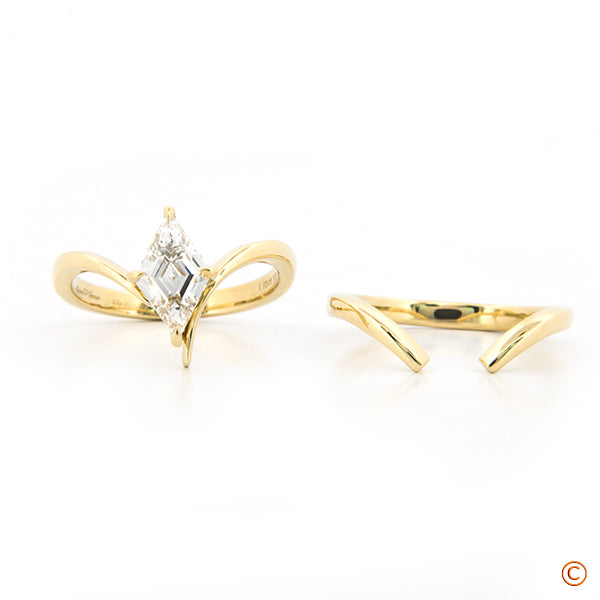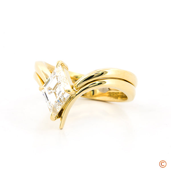 Twist "tension-like" design with Lozenge Step Cut Center Stone and Matching Wrapped Wedding Band