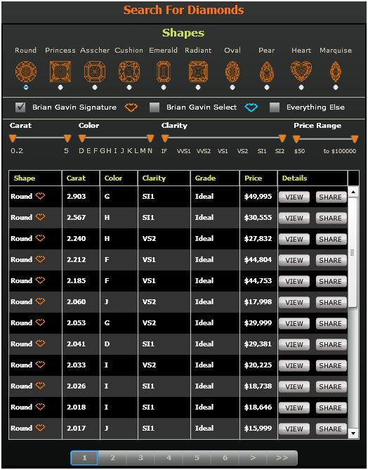 Clicking on the VIEW button in the diamond details leads to the actual website where more details of specific diamonds can be viewed and diamonds can be purchased. Clicking on the SHARE button allows you to easily share details of a diamond with your Facebook friends and ask them for their opinions.
