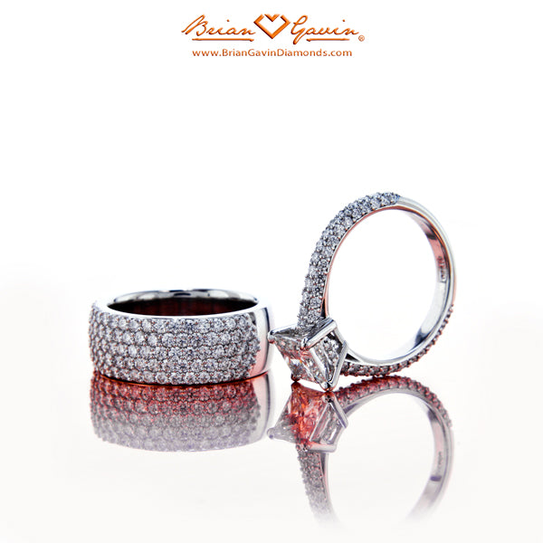About 2 months ago Tara called in to discuss her wedding band. The shank of her engagement ring is rounded and she wanted the wedding band to be more of a flat shaped band with 5 rows of Brian Gavin Signature melee stopping at approx. the same point as the melee on the engagement ring. Her ring size is the same on both hands and she wanted to be able to wear the rings together and separately. She sent in her engagement ring and we created the band using CAD. We emailed her the CAD files for approval and she said that the design was exactly what she had in mind as she didn't want an exact matching band