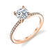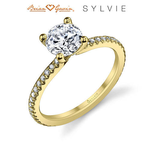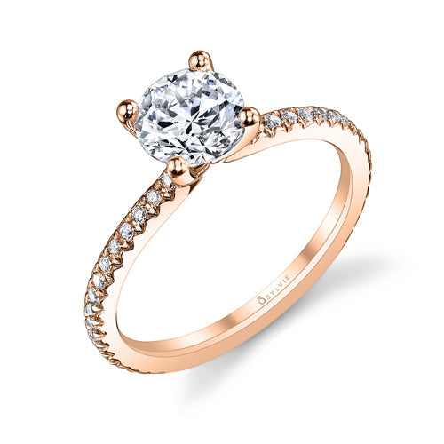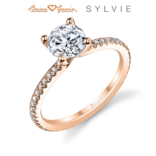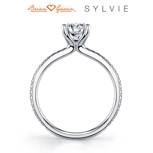 "Designed By a Woman, for a Woman", the Adorlee solitaire engagement ring from the Sylvie Collection, features 0.21ctw diamond melee and available in platinum and 14K or 18K rose, yellow, or white gold. Available for any shape center stone. Price is for setting only and does not include center stone. Add $150 for diamonds larger than 2 carats. Please note that for ring sizes above size 8, additional fees will apply. This is due to the increase in diamonds and metal required. Please contact us for larger ring sizes. Select your diamond from our extensive online diamond inventory. Matching band is product number 7649.