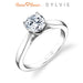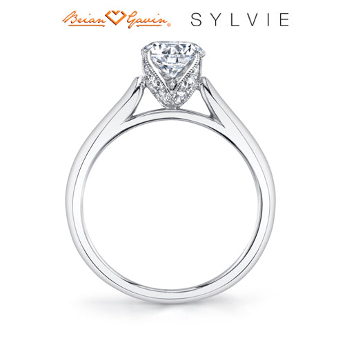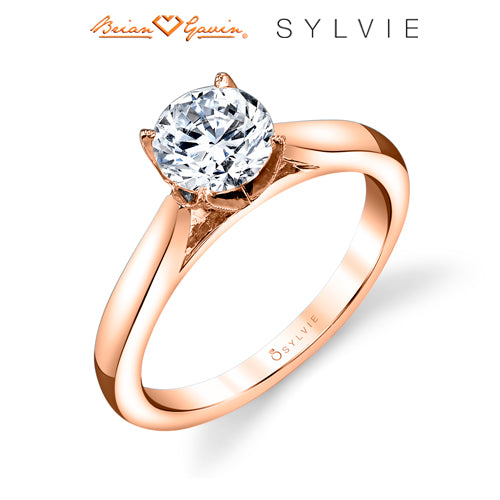 "Designed By a Woman, for a Woman," the Aubree elegant modern solitaire engagement ring features a shiny high polished shank that splits at the under carriage. Part of the Sylvie Collection this setting is available in platinum and 18K rose, yellow, or white gold. Can be customized for any shape center stone. Price is for setting only. Select your diamond from our extensive online diamond inventory. This solitaire was made to be worn with any of Sylvie's wedding bands, options are endless.