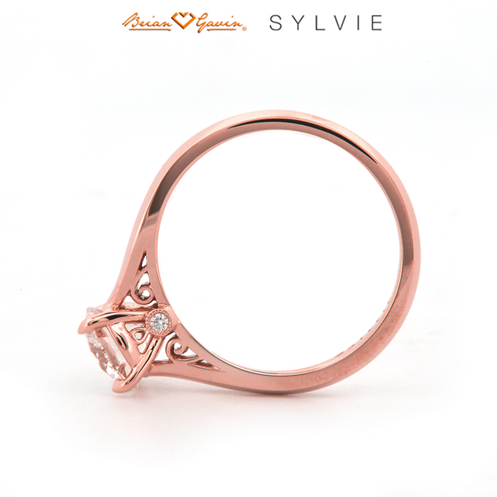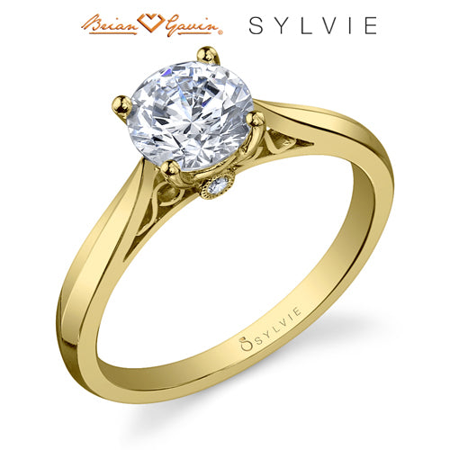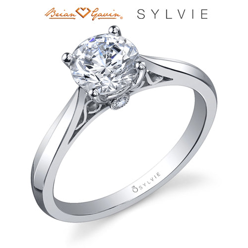 "Designed By a Woman, for a Woman", the Carina solitaire high polish engagement ring from the Sylvie Collection, features 0.03ctw diamond melee and available in platinum and 14K or 18K rose, yellow, or white gold. Available for any shape center stone. Price is for setting only and does not include center stone. Add $150 for diamonds larger than 2 carats. Please note that for ring sizes above size 8, additional fees will apply. This is due to the increase in diamonds and metal required. Please contact us for larger ring sizes. Select your diamond from our extensive online diamond inventory. Matching band is product number 7671