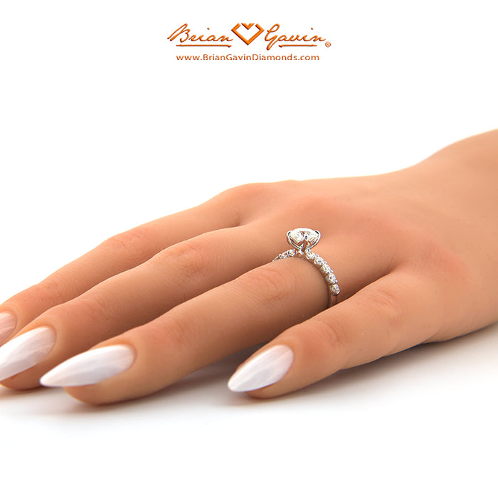 Shared prong half eternity setting featuring approx. 0.50 ctw F/G VS Brian Gavin Signature melee and the TRUTH head. Price is for setting only for diamonds up to 2 carats. Add $150 for diamonds larger than 2 carats. Please note that for ring sizes above size 8, additional fees will apply. This is due to the increase in diamonds and metal required. Please contact us for larger ring sizes. Select your center stone from our extensive online diamond inventory. Matching band is SKU #5392