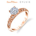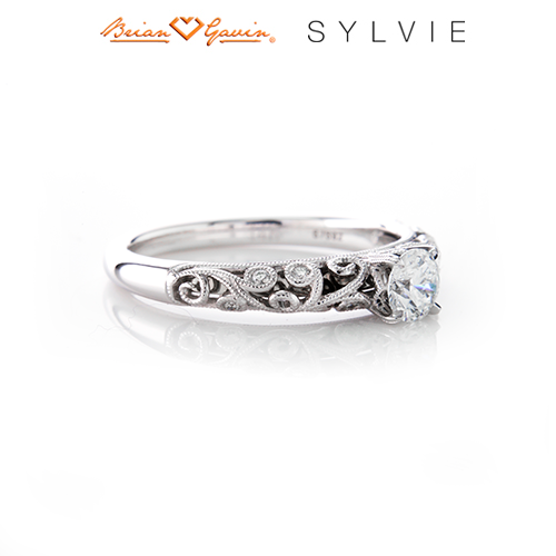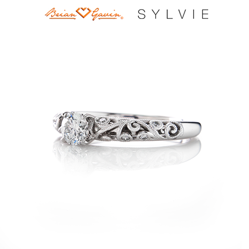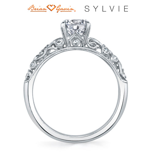 "Designed By a Woman, for a Woman," the Elaina vintage inspired engagement ring features a milgrain accented filigree swirling down the diamond encrusted shank for a total weight of .06 carats. Part of the Sylvie Collection this setting is available in platinum and 18K rose, yellow, or white gold. Available for any shape center stone. Price is for setting only and does not include center stone. Add $150 for diamonds larger than 2 carats. Please note that for ring sizes above size 8, additional fees will apply. This is due to the increase in diamonds and metal required. Please contact us for larger ring sizes. Select your diamond from our extensive online diamond inventory. Matching band is product number 7654