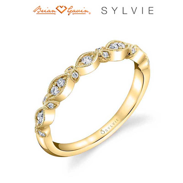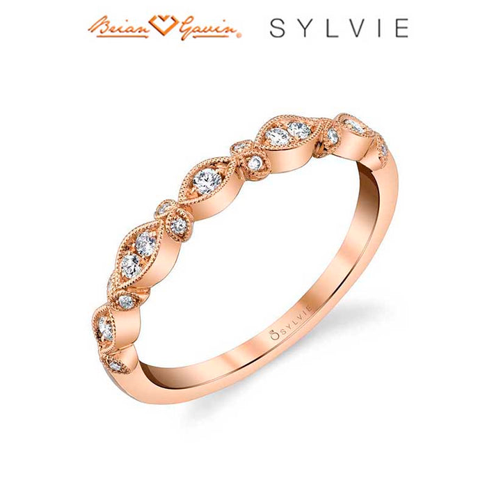 This stunning flower stackable band features 0.13 carats of H-I SI2 shimmering diamonds in alternating marquise and delicate flower petal shaped settings surrounded by milgrain beading. Pair it with any engagement ring or mix and match metals with other stackable bands for a fun fashionable accessory.