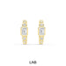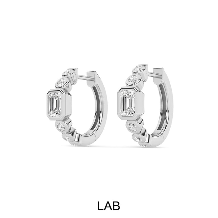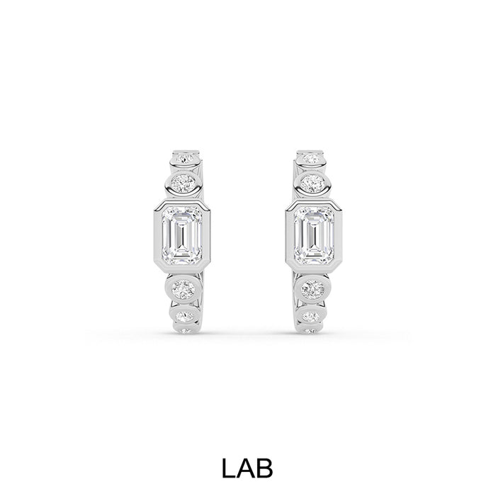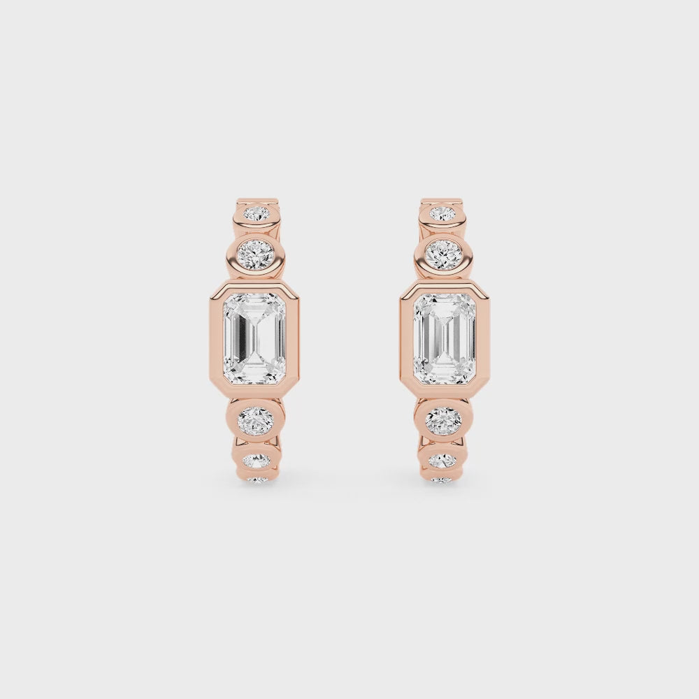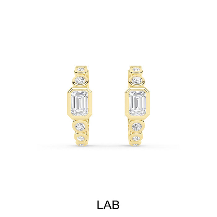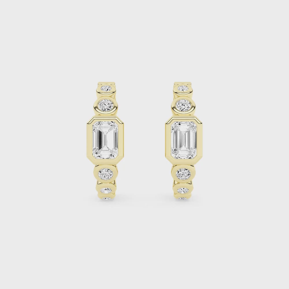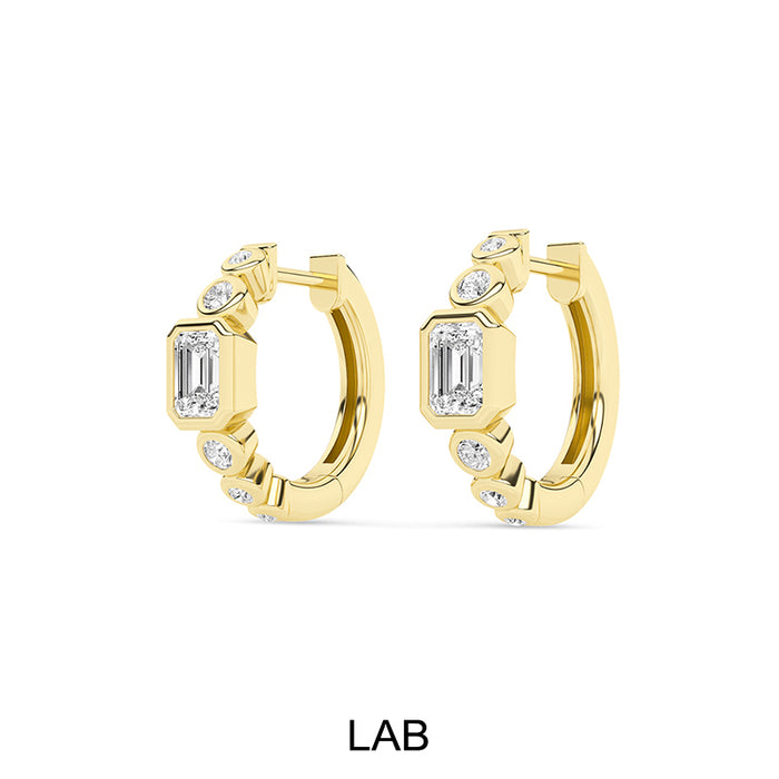 14K Gold Bezel Set Emerald & Round Shaped Lab Grown Diamond Huggie Hoop Earrings. These Diamond Hoop Earrings feature approximately 1.0ct of F/G VS Lab Diamonds.