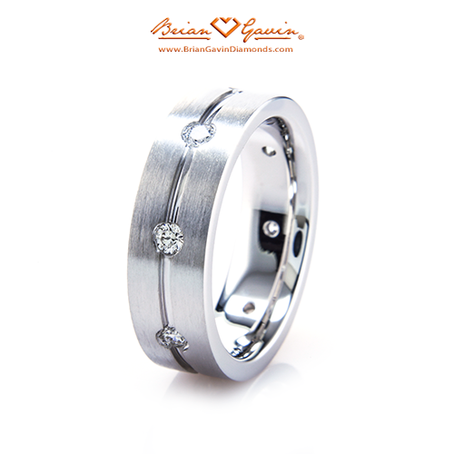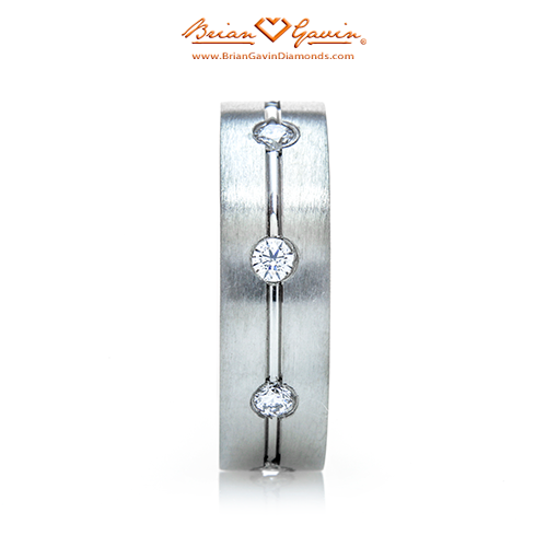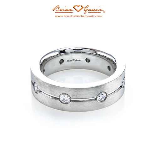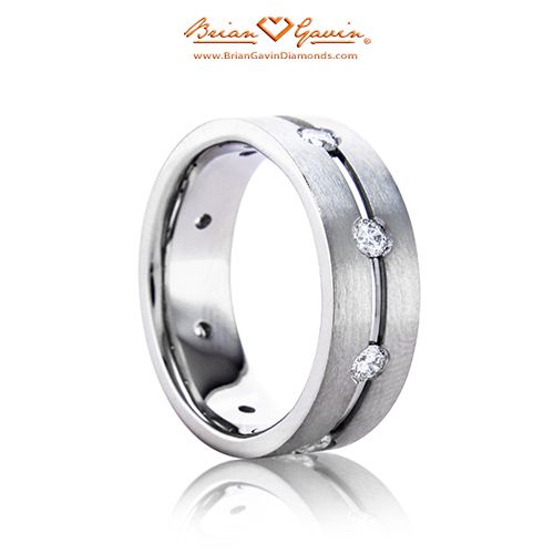 Men's Satin Diamond Wedding Band with Polished Center is 7mm wide and features 8 x .07 ct (approx. 0.56 ctw) G VS burnish set diamond melee. Prices good for up to size 10. Size 10 weighs approx. 12.7 grams in 14K white gold, 15.24 grams in 18K white gold and 21.59 grams in platinum. Call for pricing of larger sizes. This ring can not be resized and is a final sale.