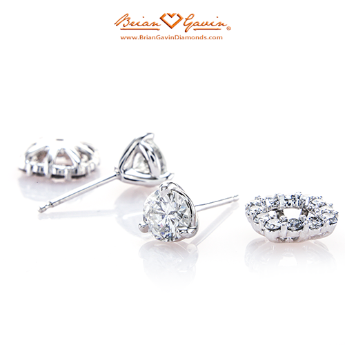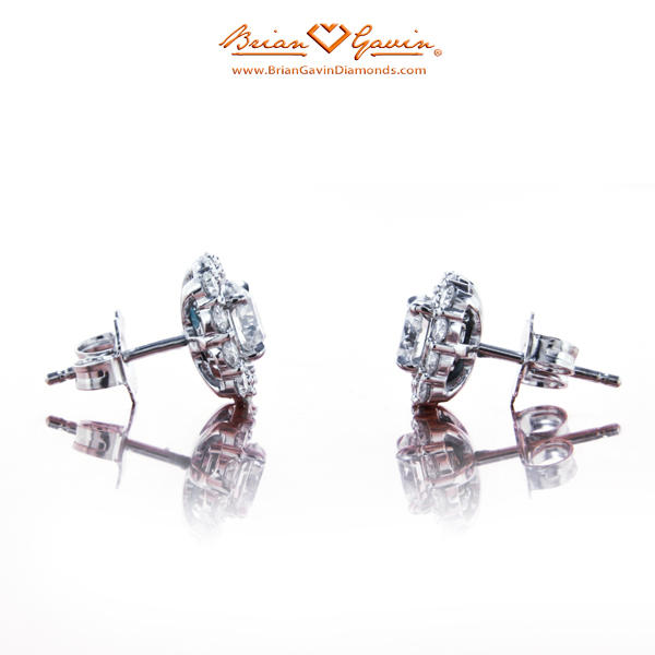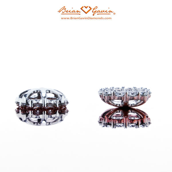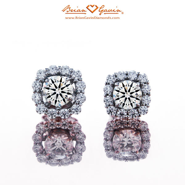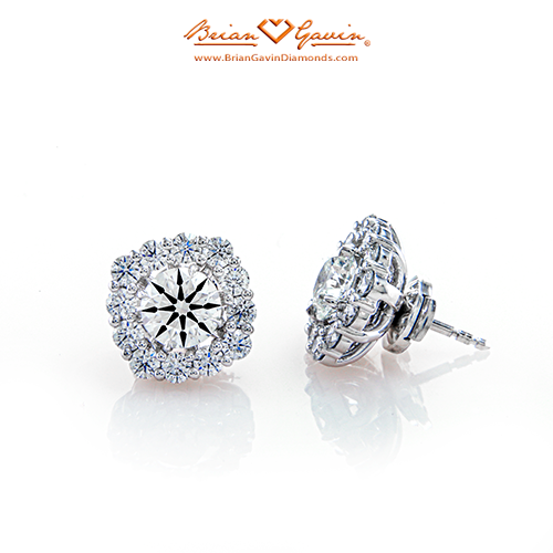 These stunning cushion shaped diamond earring jackets for either cushion cut or round studs feature 24 x .02 ct F/G VS Brian Gavin Signature hearts and arrows melee (approx. 0.48 ctw). They come in 2 sizes and measure 8mm or 9mm. Can accommodate cushion or round diamonds with a diameter of 4.5 to 5.5mm.