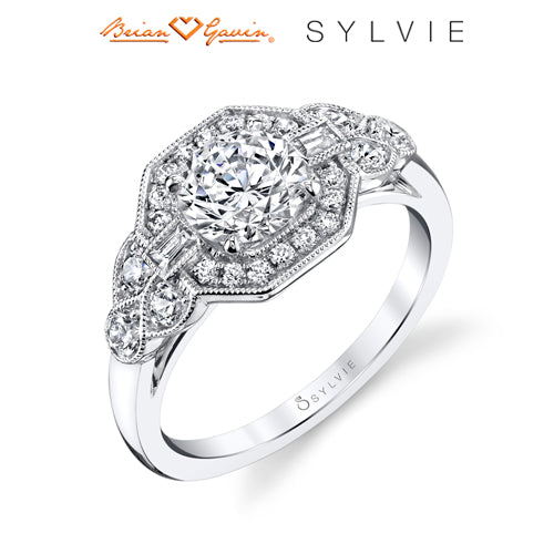 "Designed By a Woman, for a Woman," the Francesca unique mixed shape vintage engagement ring features a glistening halo and baguette diamonds on each side, all with milgrain beaded frames. Flowing down the sides on the shiny shank are more shimmering diamonds in three pear shaped frames with milgrain beaded trim. The total weight of this captivating ring is 0.57 carats. Part of the Sylvie Collection this setting is available in platinum and 18K rose, yellow, or white gold. Available for any shape center stone. Price is for setting only and does not include center stone. Add $150 for diamonds larger than 2 carats. Please note that for ring sizes above size 8, additional fees will apply. This is due to the increase in diamonds and metal required. Please contact us for larger ring sizes. Select your diamond from our extensive online diamond inventory. Matching band is product 7651