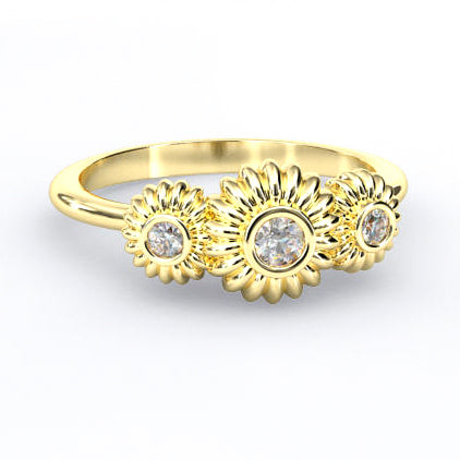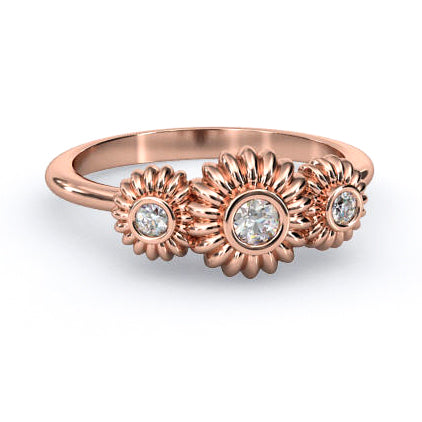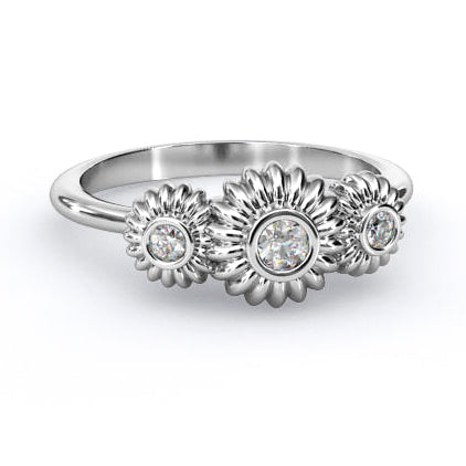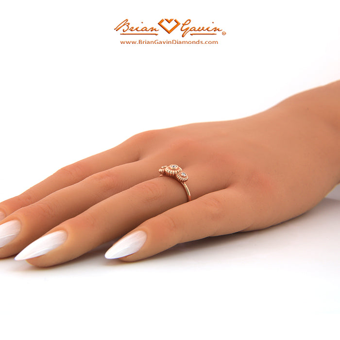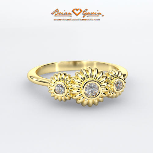 A fashionable, 3 stone right hand ring with a flowery touch, available in 14K white, rose, or yellow gold. This diamond setting comes with 0.08ctw Brian Gavin Signature F/G VS diamonds - 0.04 ct center stone and two 0.02 ct sides stones. Part of the Fiorella Collectionâ„¢ - pendants, earrings and solitaire rings are also available.
