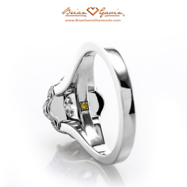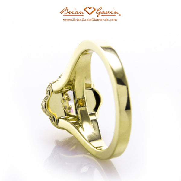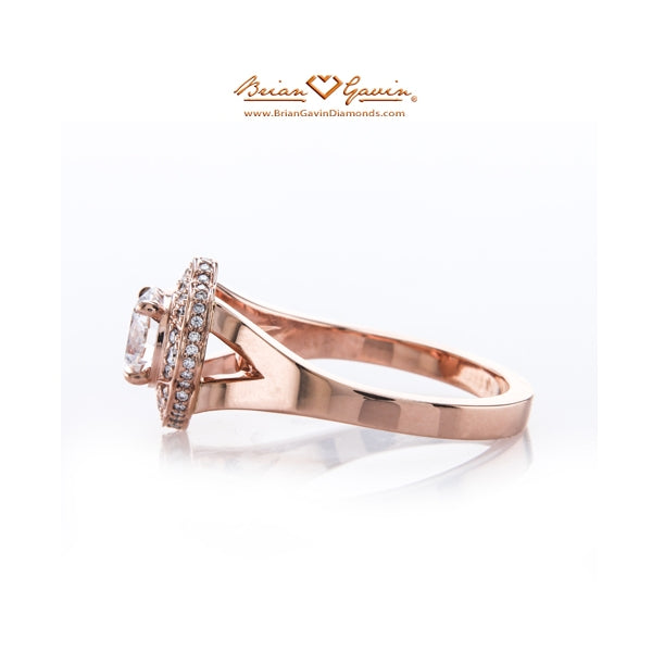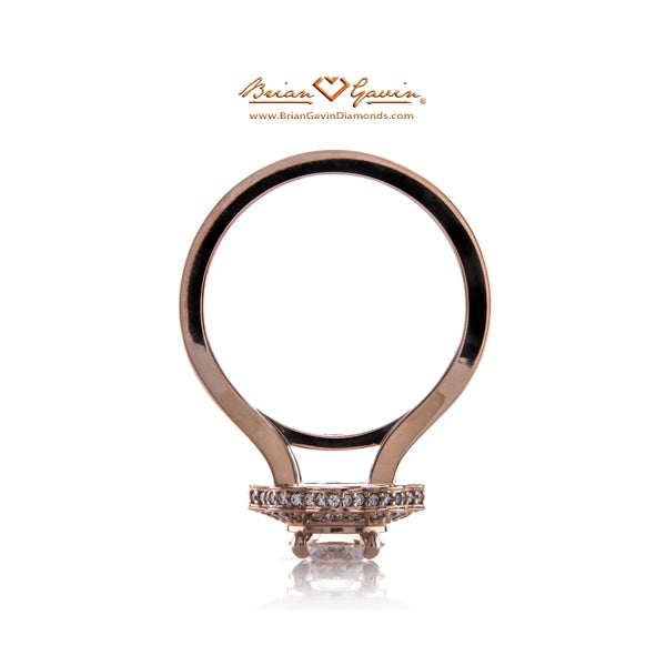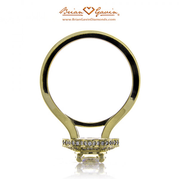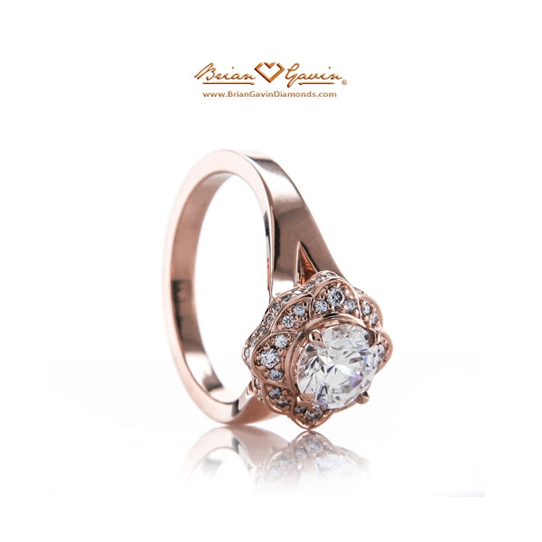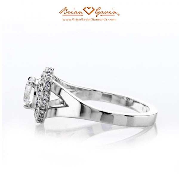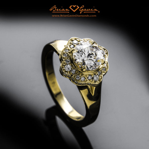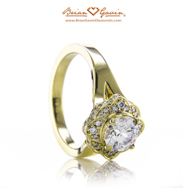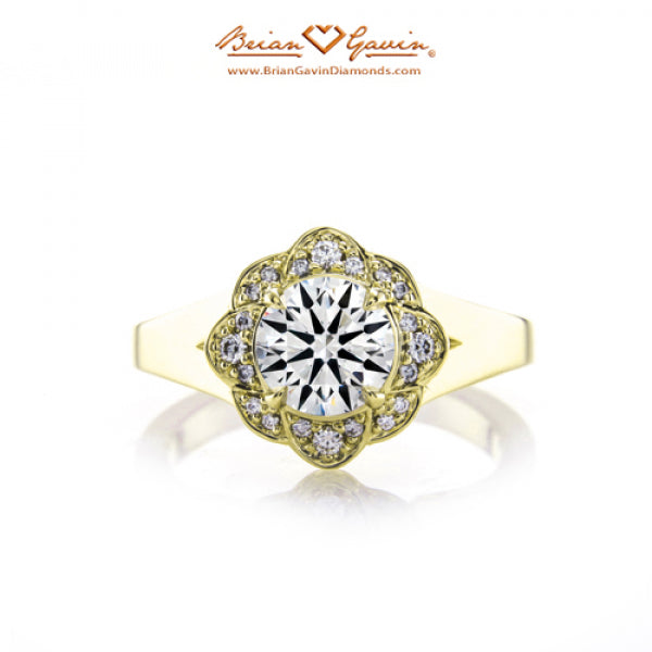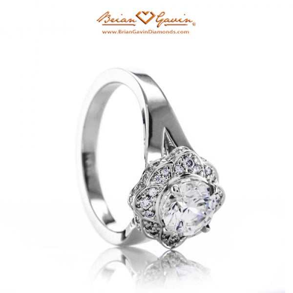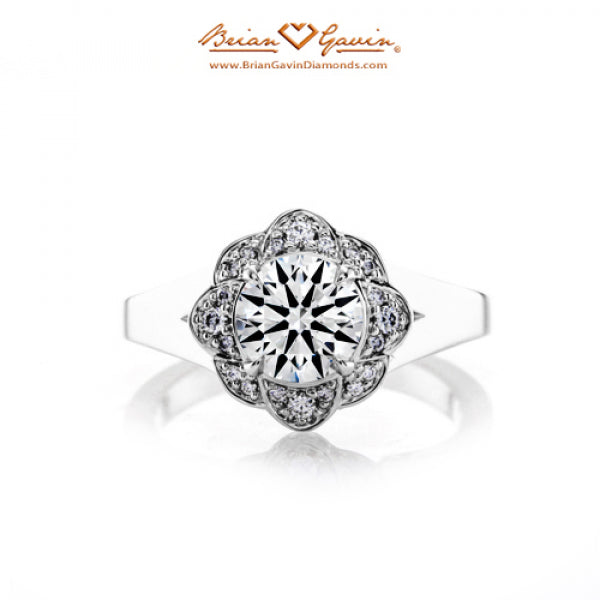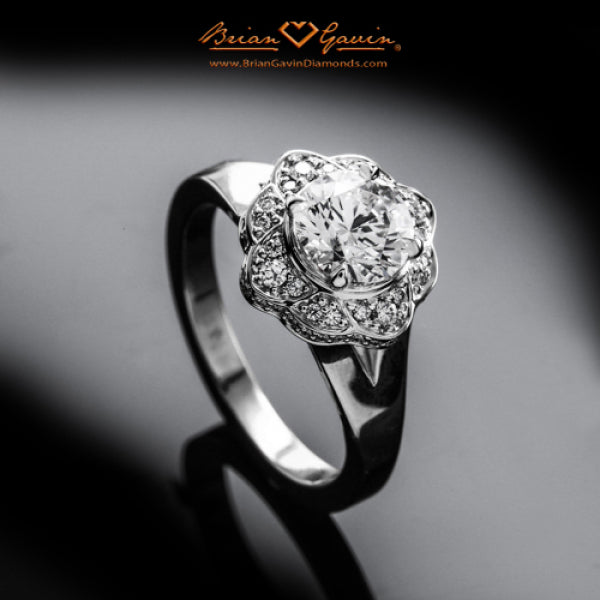 Say "you're the one" with this charming and romantic Halo Engagement Ring. As part of the new 810 Diamond Engagement Ring Collection from Brian Gavin Diamonds, this ravishing halo ring features a radiant 8-petaled rosette motif reminiscent of Tudor era jewelry. A magnificent center stone is positioned as a slightly raised detail giving the melee adorned surface an appearance of depth. These mini diamonds are Brian Gavin Signature F/G Color VS Clarity Hearts and Arrows melee, each with a CTW of 0.178. They surround the center stone in gleaming resplendence, the tip of each petal of the motif displaying two-to-three melee. The profile edge of the head features even more diamonds-- tiny inset stones visible from the side.