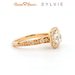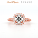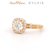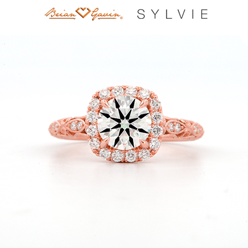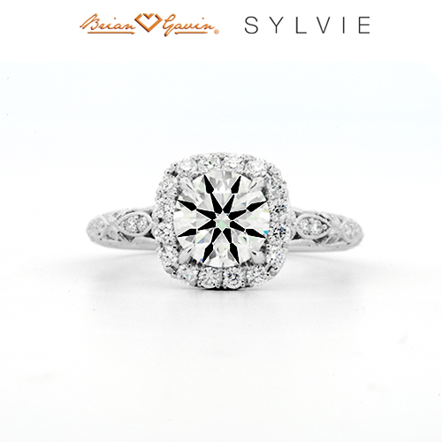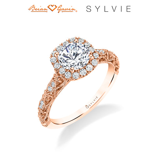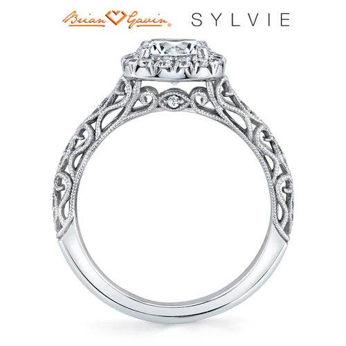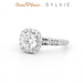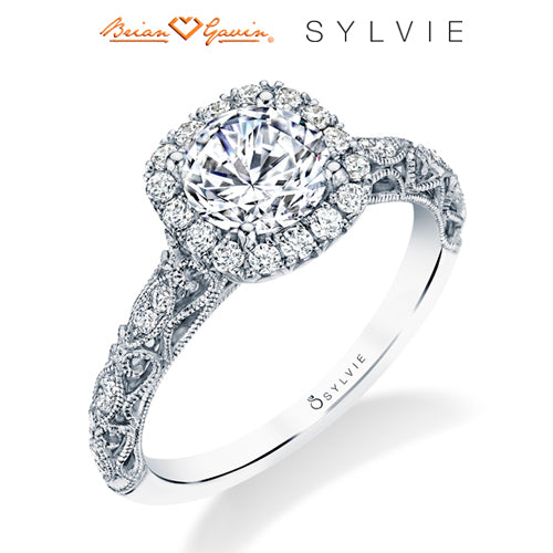 "Designed By a Woman, for a Woman," the Regine vintage halo engagement ring features Sylvie's signature cushion halo. Intricate milgrain accented filigree swirls down the diamond encrusted shank for a total weight of .37 carats. Part of the Sylvie Collection this setting is available in platinum and 18K rose, yellow, or white gold. Available for any shape center stone. Price is for setting only and does not include center stone. Add $150 for diamonds larger than 2 carats. Please note that for ring sizes above size 8, additional fees will apply. This is due to the increase in diamonds and metal required. Please contact us for larger ring sizes. Select your diamond from our extensive online diamond inventory. Matching band also available.