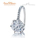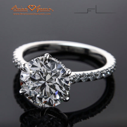 This is not your average Solitaire. Six Handmade prongs and stone seats are forged from platinum wire and are meticulously built around your stone for a bespoke fit giving it a pristine look and finish that no casting process can achieve. Center stone shown is a custom cut Black by Brian Gavin 5.00ct D VS1. This item is made to order and is a final sale. Price is for setting only for diamonds up to 3 carats. Inquire about pricing for diamonds larger than 3 carats. Please note that for ring sizes above size 8, additional fees will apply. This is due to the increase in diamonds and metal required. Please contact us for larger ring sizes. Select your diamond from our extensive online inventory. Matching band is SKU #7633