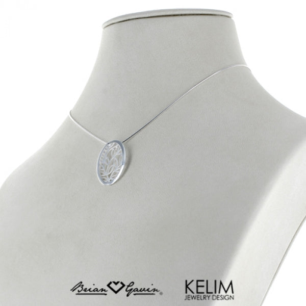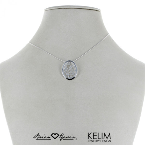 The Leaf Pendant Necklace from the Kelim Jewelry Design collection adds a touch of elegance to any outfit. The beautiful pendant handcrafted in exquisite detail of a leaf collage is made from silver with a matte silver finish. Measuring 1.3125 inches in length and 0.9375 in width, this detailed pendant comes with a 17-inch silver snake chain.