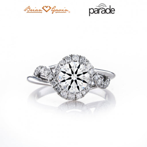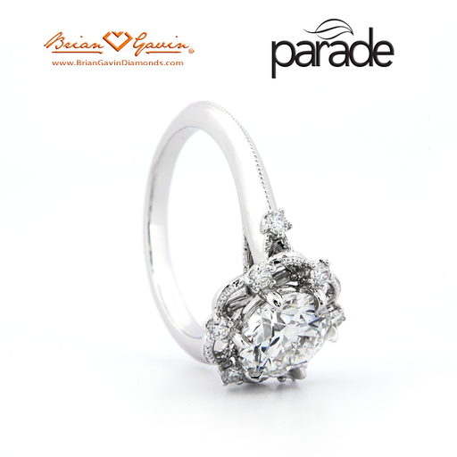 Parade™ A unique halo made with intricate detail flows around a brilliant center stone as milgrain-etched metal weaves through open space reaching ...