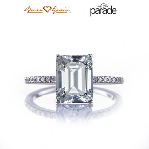 Parade™ A classic diamond band is topped with a delicate basket securing an emerald shaped center stone, featuring 18 round cut diamond melee (0.13...