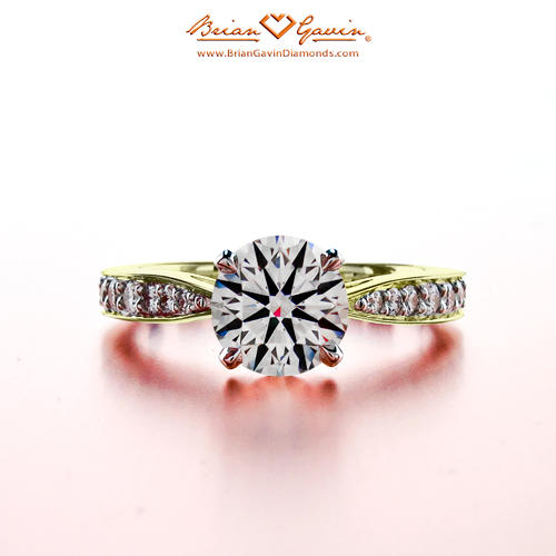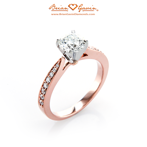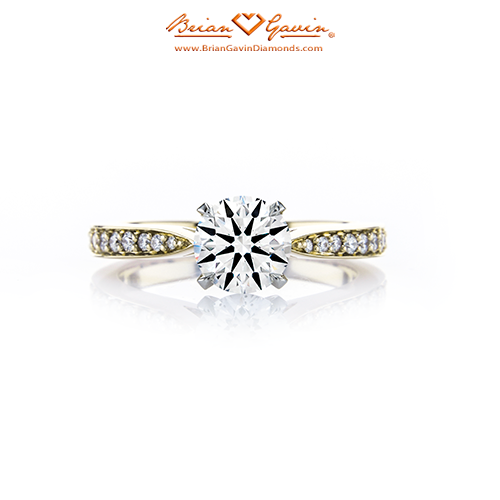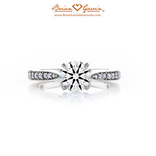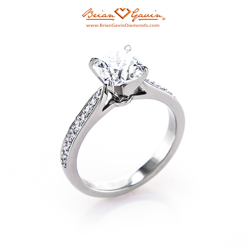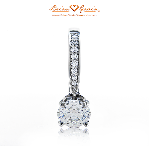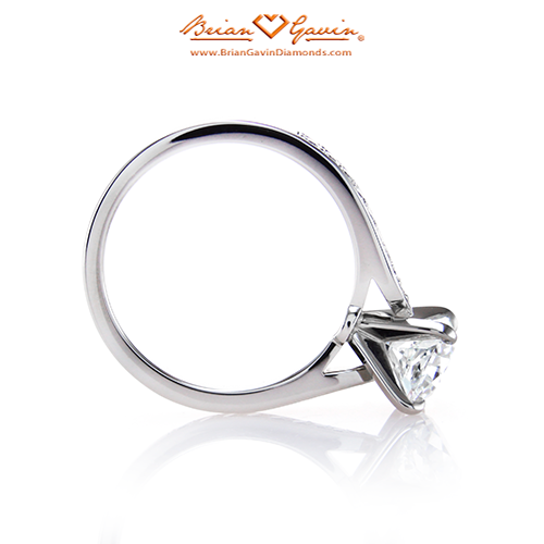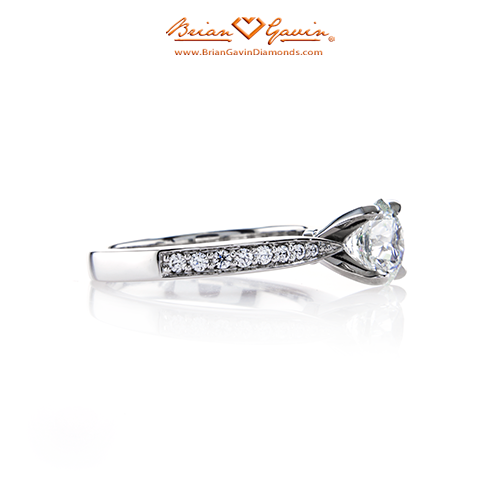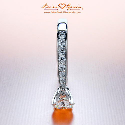 This fluid solitaire features 8 stones on each side approx. 0.22 ctw Brian Gavin Signature melee F/G VS and an open 4 prong head. Can also accommodate the "Truth" head. Price is for setting only and does not include center stone. Add $150 for diamonds larger than 2 carats. Please note that for ring sizes above size 8, additional fees will apply. This is due to the increase in diamonds and metal required. Please contact us for larger ring sizes. Select your center stone from our extensive online database