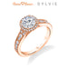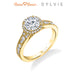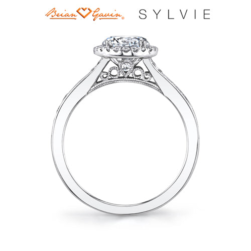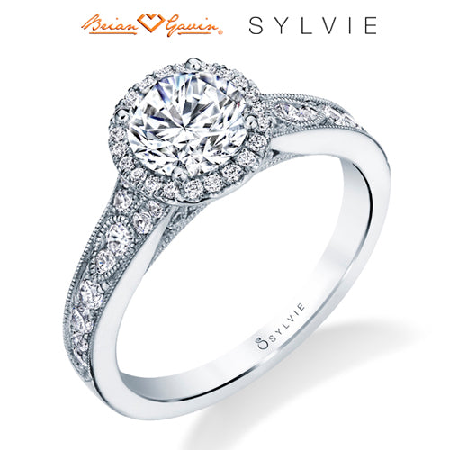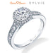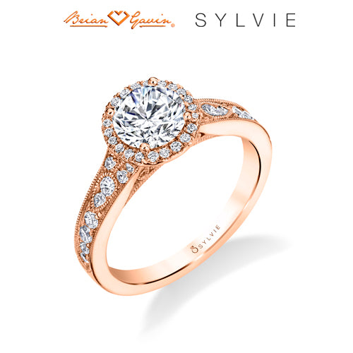 "Designed By a Woman, for a Woman," the Quinn vintage engagement ring features Sylvie's signature halo and beautiful milgrain detailing down the shank. The total weight of this vintage engagement ring is 0.40 carats. Part of the Sylvie Collection this setting is available in platinum and 18K rose, yellow, or white gold. Available for any shape center stone. Price is for setting only and does not include center stone. Add $150 for diamonds larger than 2 carats. Please note that for ring sizes above size 8, additional fees will apply. This is due to the increase in diamonds and metal required. Please contact us for larger ring sizes. Select your diamond from our extensive online diamond inventory. Matching band is product number 7660