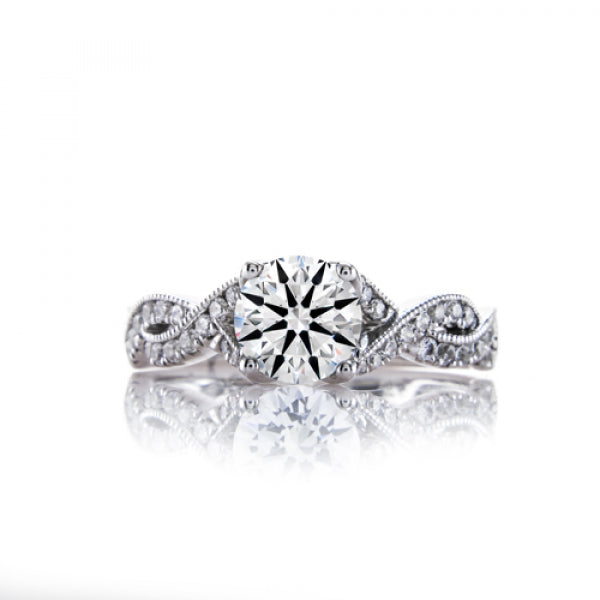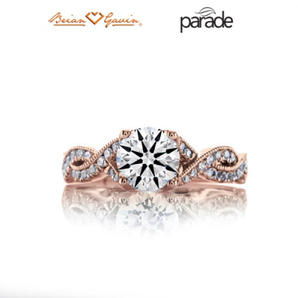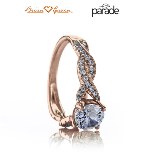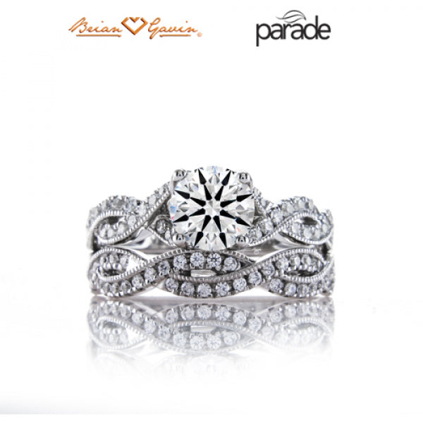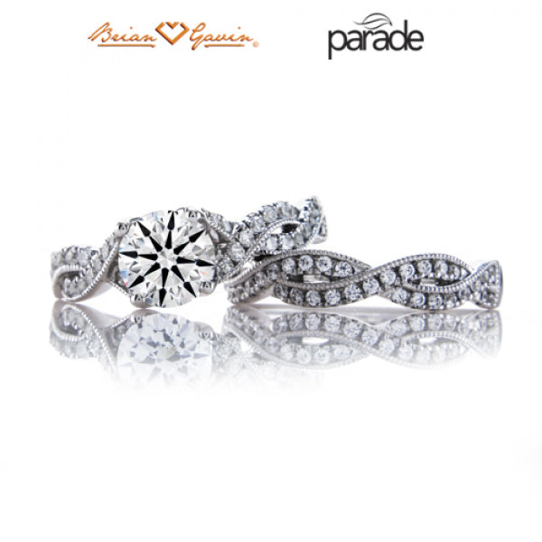 Parade™ Signature Lyria Crown adds refined femininity to a contemporary design with open twists of diamonds finished with intricate milgrain detailing. Featuring 40 round cut diamond melee (0.30 ctw). Price is for setting only for diamonds up to 2 carats. Add $150 for diamonds larger than 2 carats. Please note that for ring sizes above size 8, additional fees will apply. This is due to the increase in diamonds and metal required. Please contact us for larger ring sizes. Select your diamond from our extensive online inventory.Matching Band is SKU #7106