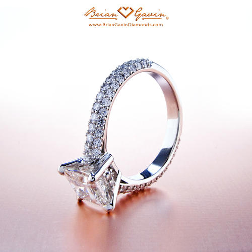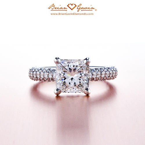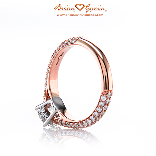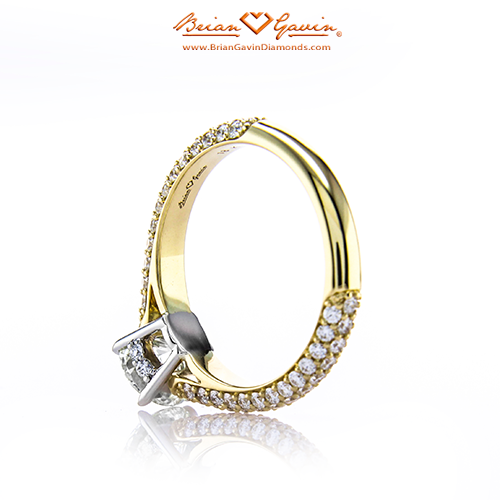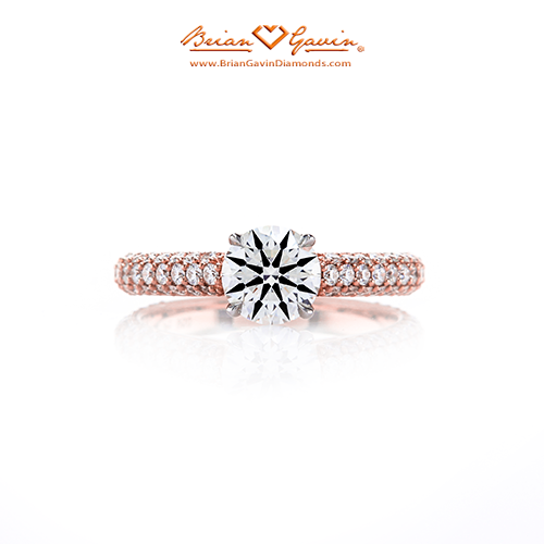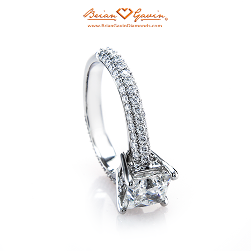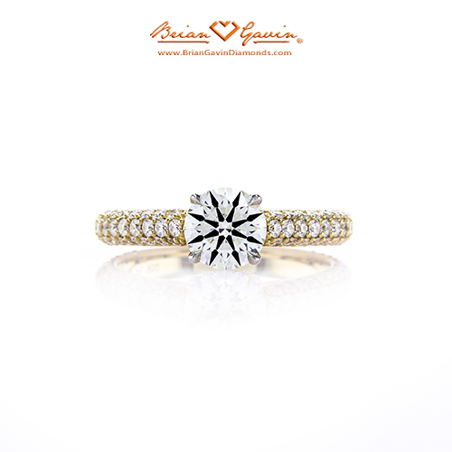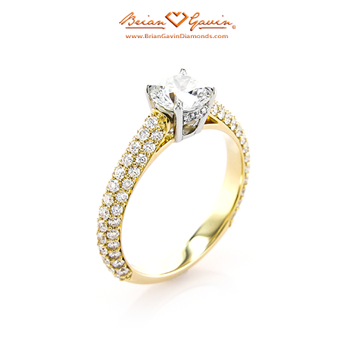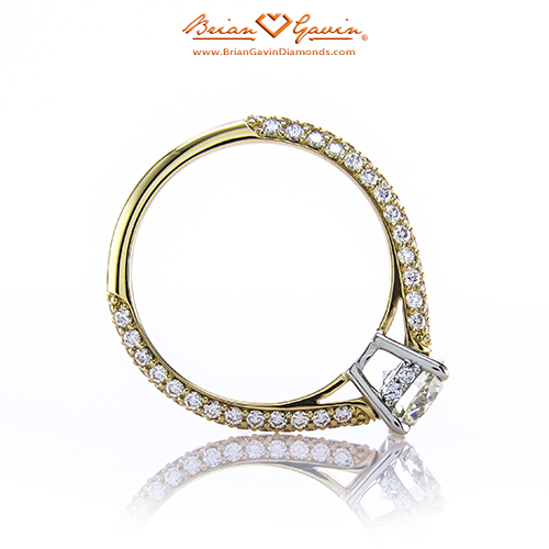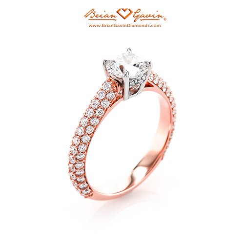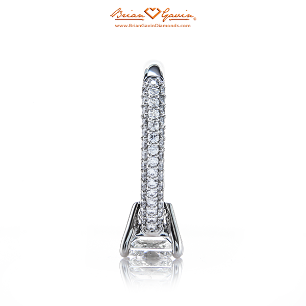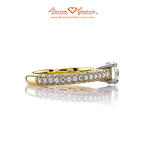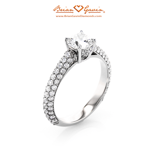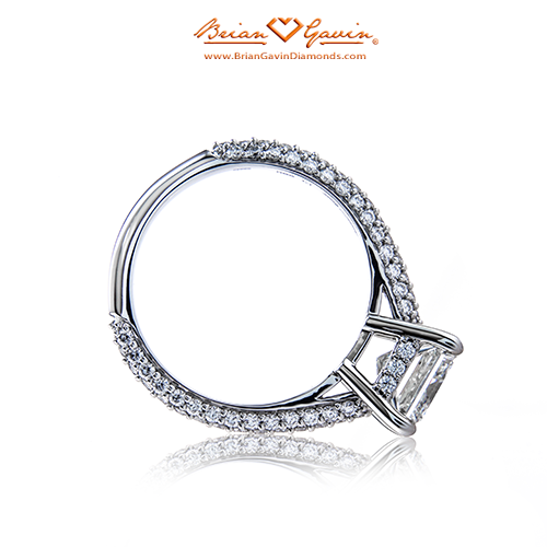 3 Sided Diamond Pave Setting featuring approx .75 ctw F/G VS Brian Gavin Signature Melee in the center of the basket and 75% of the way around the shank. Price is for setting only and does not include center stone. Add $150 for diamonds larger than 2 carats. Please note that for ring sizes above size 8, additional fees will apply. This is due to the increase in diamonds and metal required. Please contact us for larger ring sizes. Select your diamond from our extensive online diamond inventory.