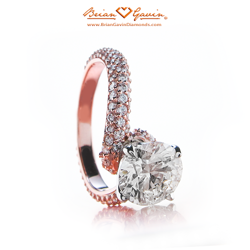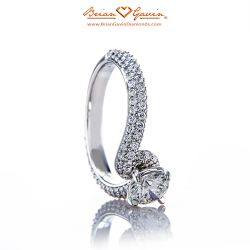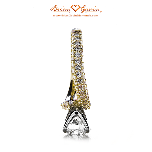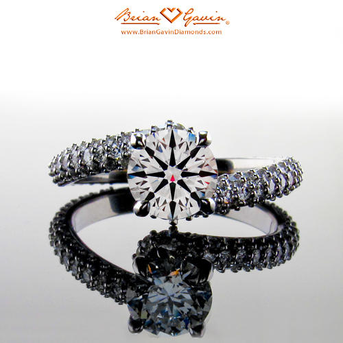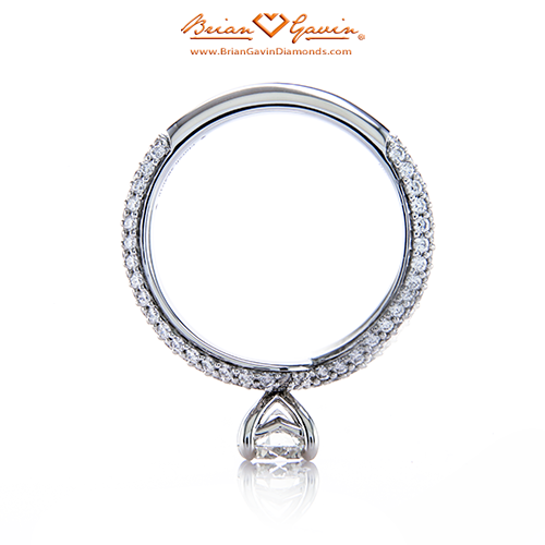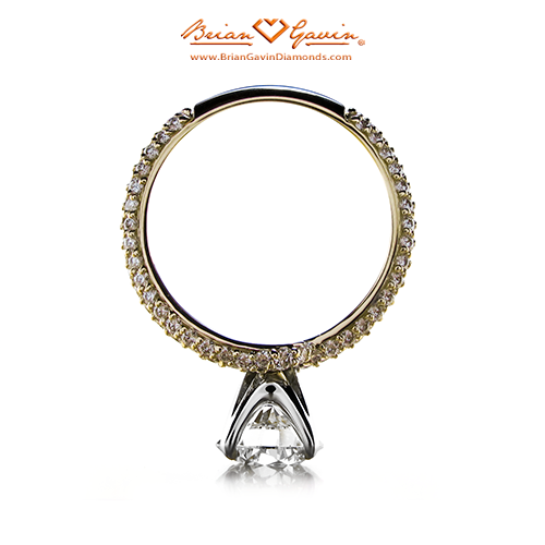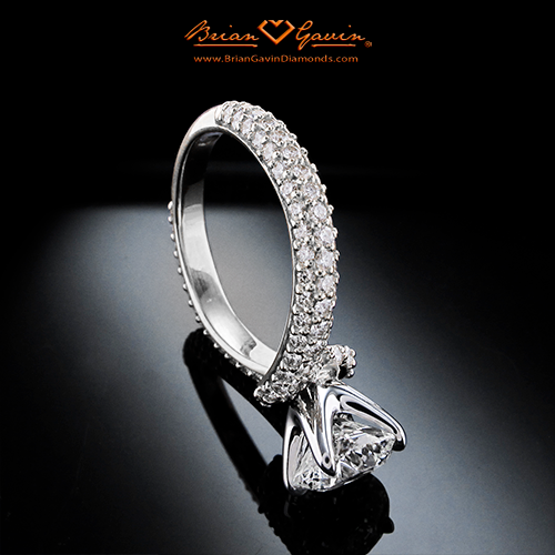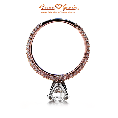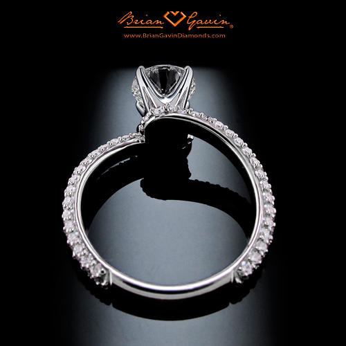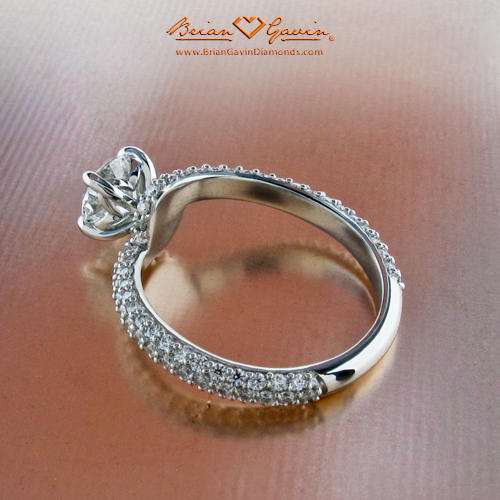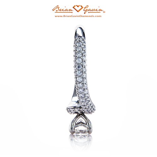 Custom 3 row pave setting featuring F/G VS Brian Gavin Signature melee with the Truth head. Price is for setting only and does not include center stone. Add $150 for diamonds larger than 2 carats. Please note that for ring sizes above size 8, additional fees will apply. This is due to the increase in diamonds and metal required. Please contact us for larger ring sizes. Select your center stone from our extensive online inventory. Matching Band is SKU #7620
