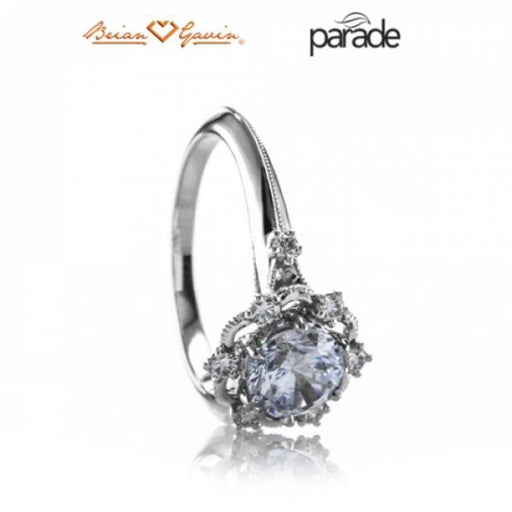 Parade™ Intricate milgrain-etched curves of metal in open space below a tapered band of sparkling diamonds, elevating a six-pronged center stone to...