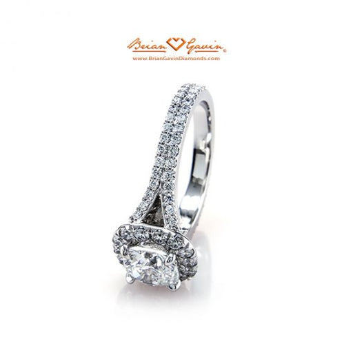 Custom split shank halo diamond engagement ring featuring approximately 0.85 ctw Brian Gavin Signature F/G VS hearts and arrows diamond melee. Cata...