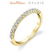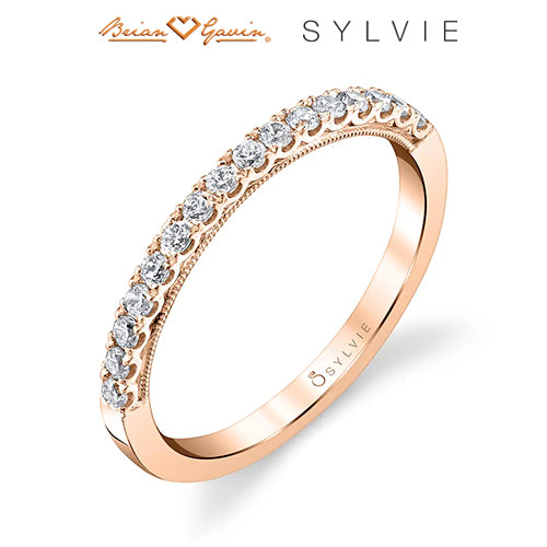 This beautiful wedding band with milgrain profile features 0.23 carats of round cut diamonds in a prong setting trailing down the band, underneath being a milgrain detailed border. Matching engagement ring is product number 7581