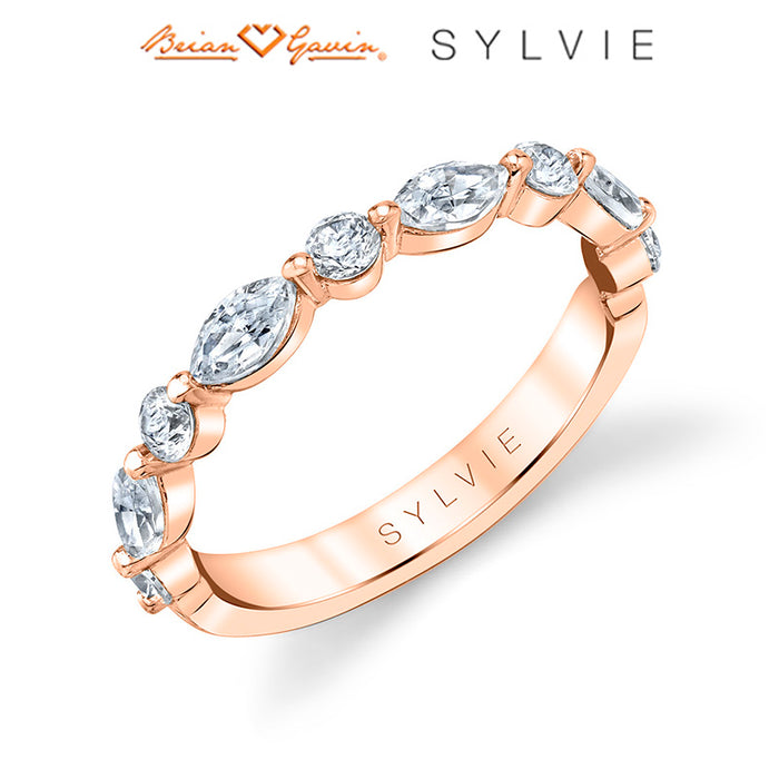This stunning marquise wedding band with shared prongs features 0.78 carats of beautiful marquise and round diamonds alternating to create a unique look! The shared prongs make this wedding band both feminine and delicate and the perfect match for any classic engagement rings.