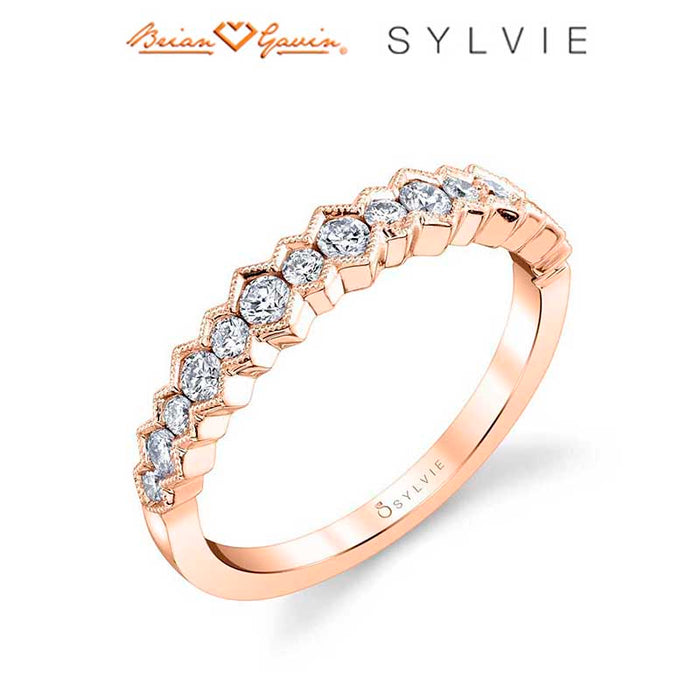 Express your own personal style with this modern wedding band. With round H-I SI2 brilliant diamonds nestled in a shared diamond shaped frame and accented with delicate milgrain details, this enchanting modern wedding band is one of a kind. When paired with your sparkling engagement ring, it will add a creative and artistic look. Mix and match this modern band with other metal colors of bands to create trendy, stylish look. The total weight of this stunning modern stackable wedding band is 0.38 carats.