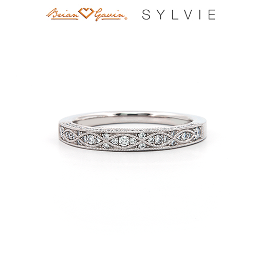 This fashionable, vintage wedding band features 0.37 carats of shimmering diamonds in its beautifully detailed shank with milgrain accents. The rhythm of accents continue on the profile sides of the shank with more channel set diamonds. Full eternity version is available. Please call for pricing details. Matching engagement ring is SKU 7574