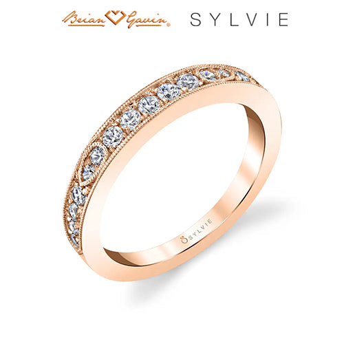This gorgeous wedding band features milgrain edging and marquise and round shaped brilliant diamonds. For a total carat weight of 0.36 carats, this wedding band pairs perfectly with product number 7586, a vintage inspired halo engagement ring.