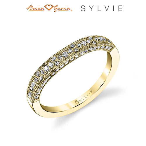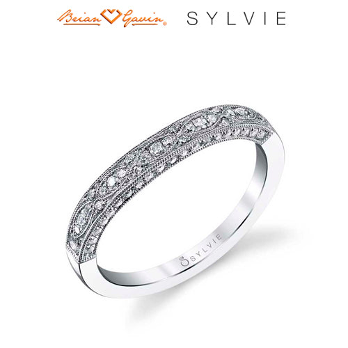 Create a unique wedding set with this hand-engraved vintage wedding band with a total of 0.24 carats. Matching engagement ring is product number 7571