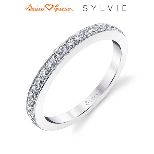 This classic wedding band features 0.28 carats of shimmering diamonds in a row with milgrain beading around the edge. Pair it with it's matching vintage engagement ring, product number 7588, for a timeless wedding ring set!