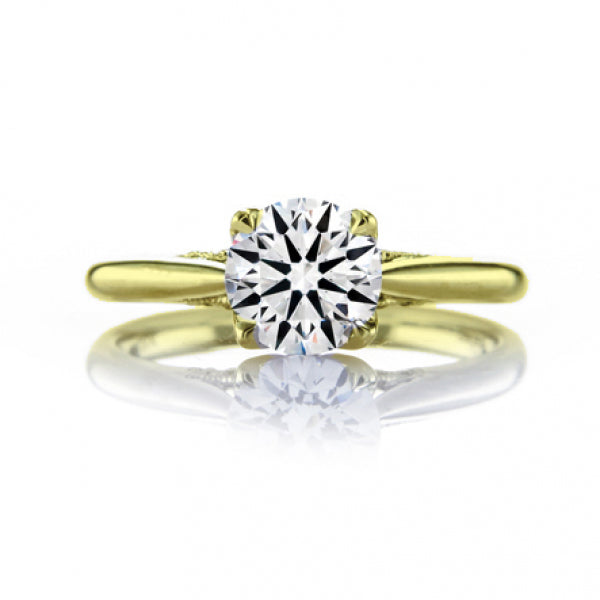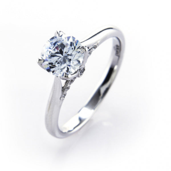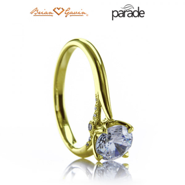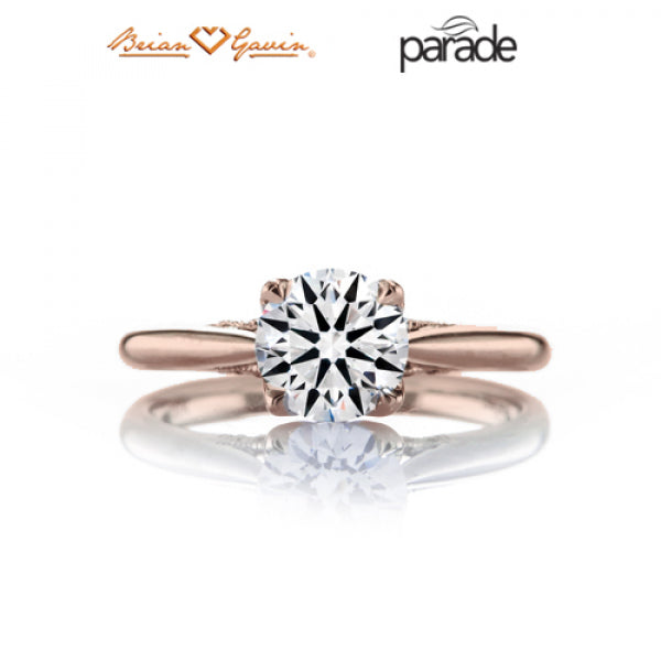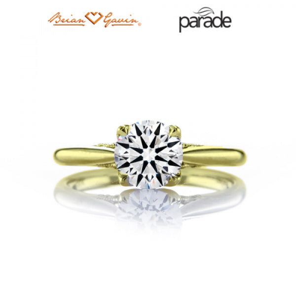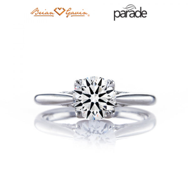 Parade™ The Lyria Signature Crown sits atop a gleaming band of high polished gold or platinum accented by 14 brilliant round diamond melee (0.05 ctw) in this classic solitaire. Price is for setting only for diamonds up to 2 carats. Add $150 for diamonds larger than 2 carats. Please note that for ring sizes above size 8, additional fees will apply. This is due to the increase in diamonds and metal required. Please contact us for larger ring sizes. Select your diamond from our extensive online inventory.