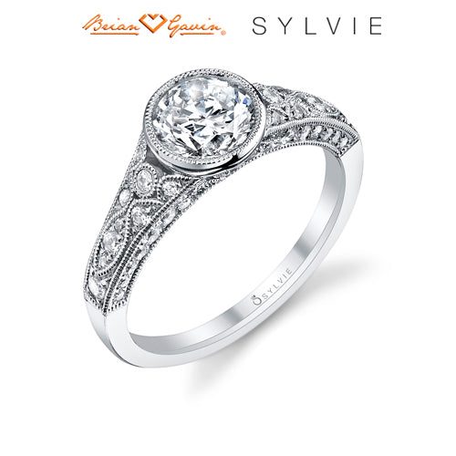 "Designed By a Woman, for a Woman", the Sylvie unique bezel set diamond ring features a unique hand crafted vintage inspired design featuring 0.54 carats of diamonds in various sizes. Part of the Sylvie Collection this setting is available in platinum and 18K rose, yellow, or white gold. Available for any shape center stone. Price is for setting only and does not include center stone. Add $150 for diamonds larger than 2 carats. Please note that for ring sizes above size 8, additional fees will apply. This is due to the increase in diamonds and metal required. Please contact us for larger ring sizes. Select your diamond from our extensive online diamond inventory. Matching band is product 7650